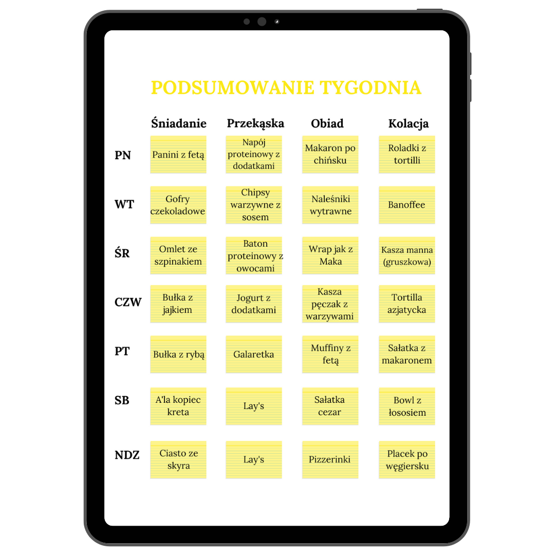 • Jadłospis nie jest dopasowany indywidualnie do potrzeb każdej osoby pod względem doboru potraw, bo może nie każdy lubi kanapki, gofry, makarony, racuchy, tortille. Jednak w poradniku znajdziesz odpowiedzi co zrobić w takiej sytuacji.