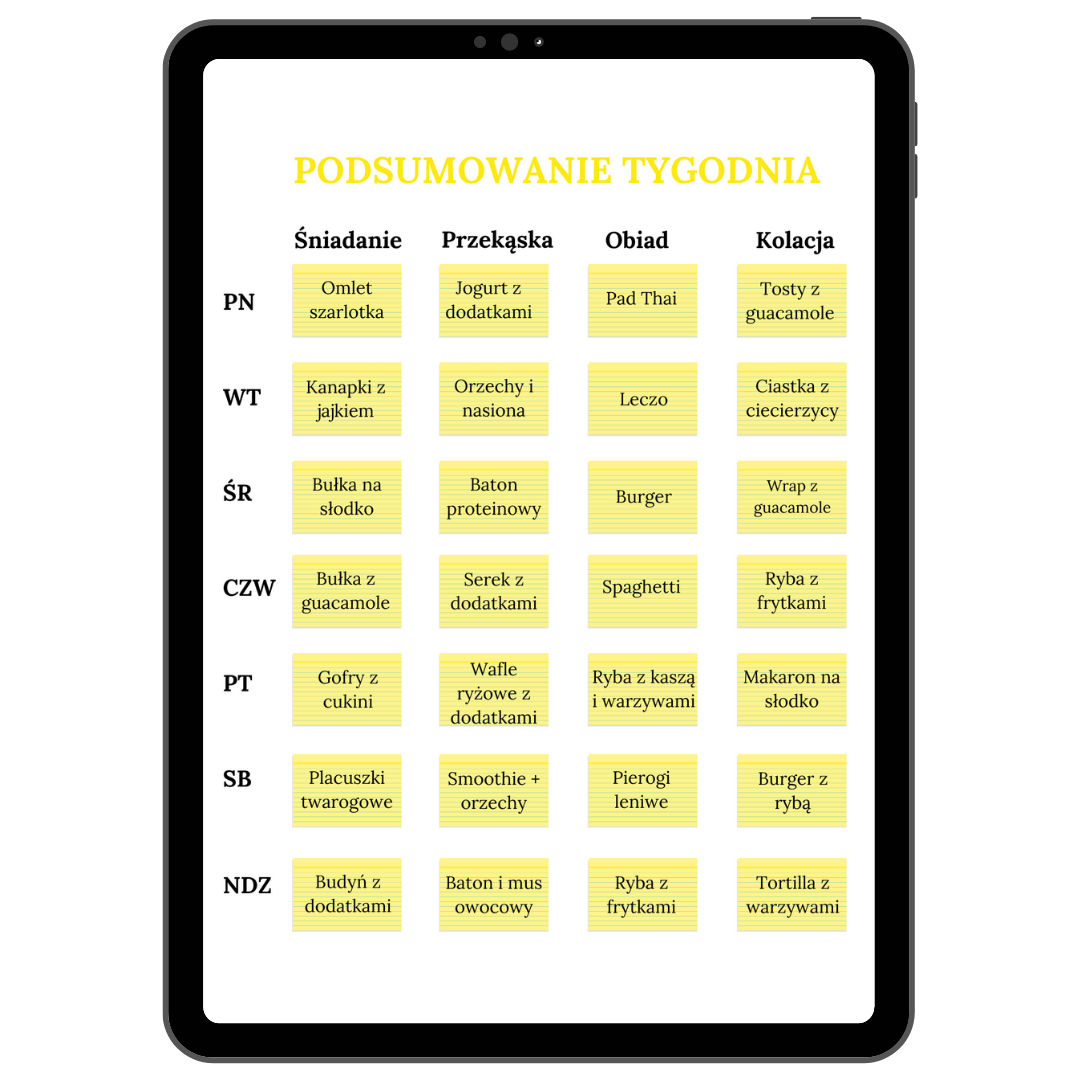 • Jadłospis nie jest dopasowany indywidualnie do potrzeb każdej osoby pod względem doboru potraw, bo może nie każdy lubi kanapki, gofry, makarony, racuchy, tortille. Jednak w poradniku znajdziesz odpowiedzi co zrobić w takiej sytuacji.