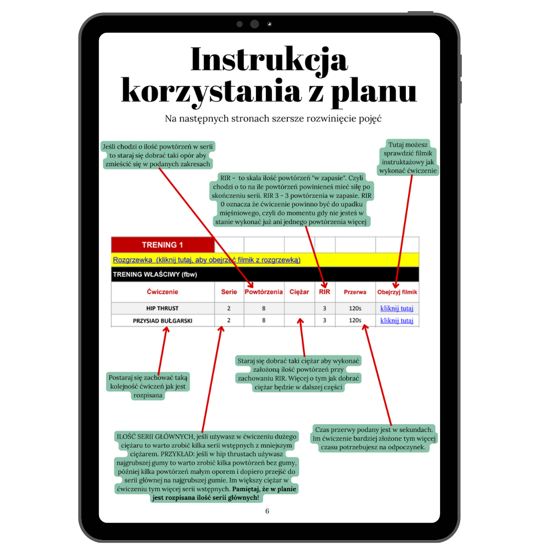 - W środku znajdziesz dokładną instrukcję jak korzystać z planu oraz 30 stron poradnika, aby wprowadzić Cię w świat treningu.