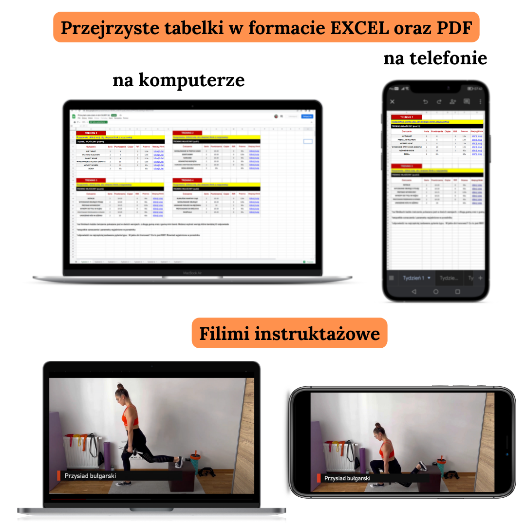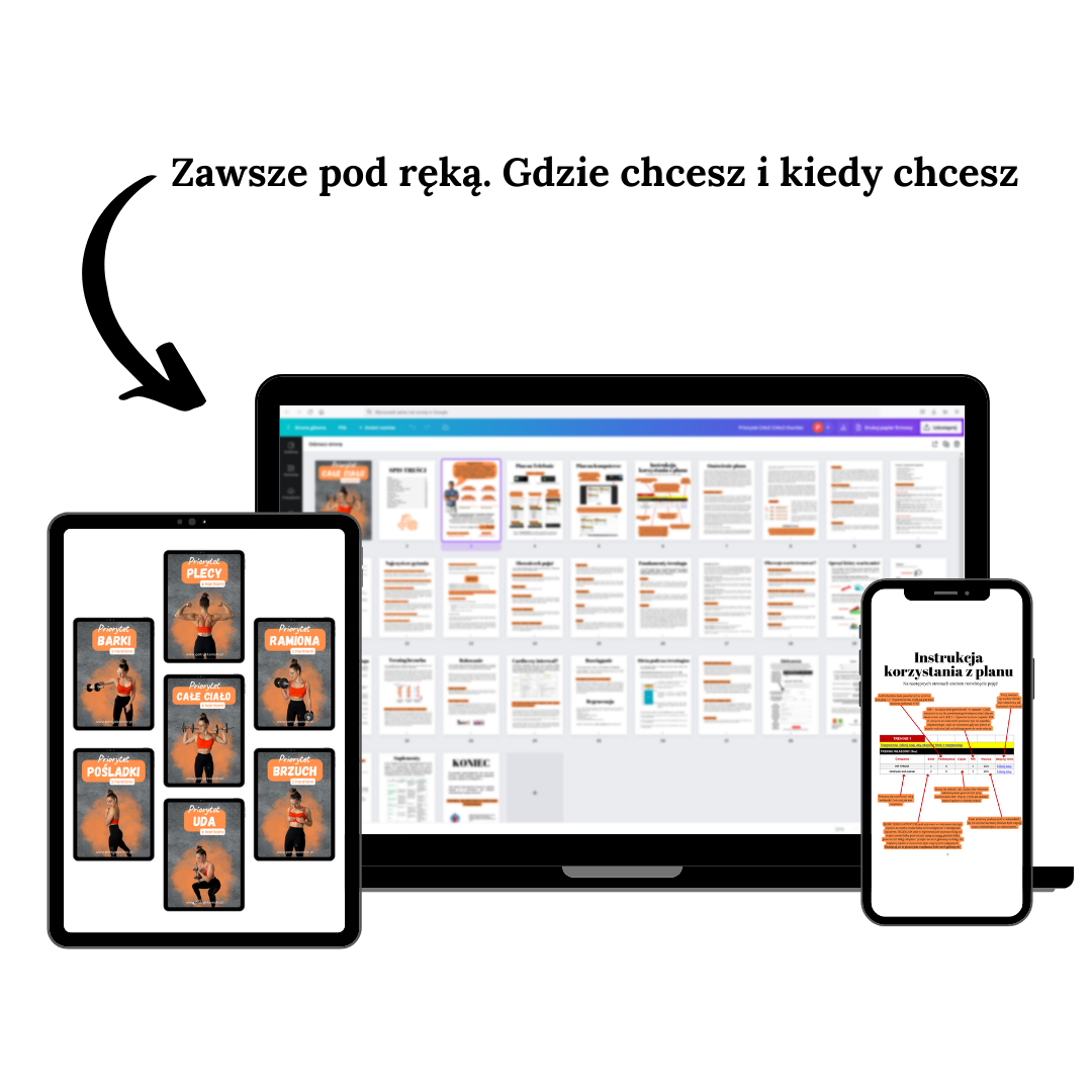 - W środku znajdziesz dokładną instrukcję jak korzystać z planu oraz 30 stron poradnika, aby wprowadzić Cię w świat treningu.