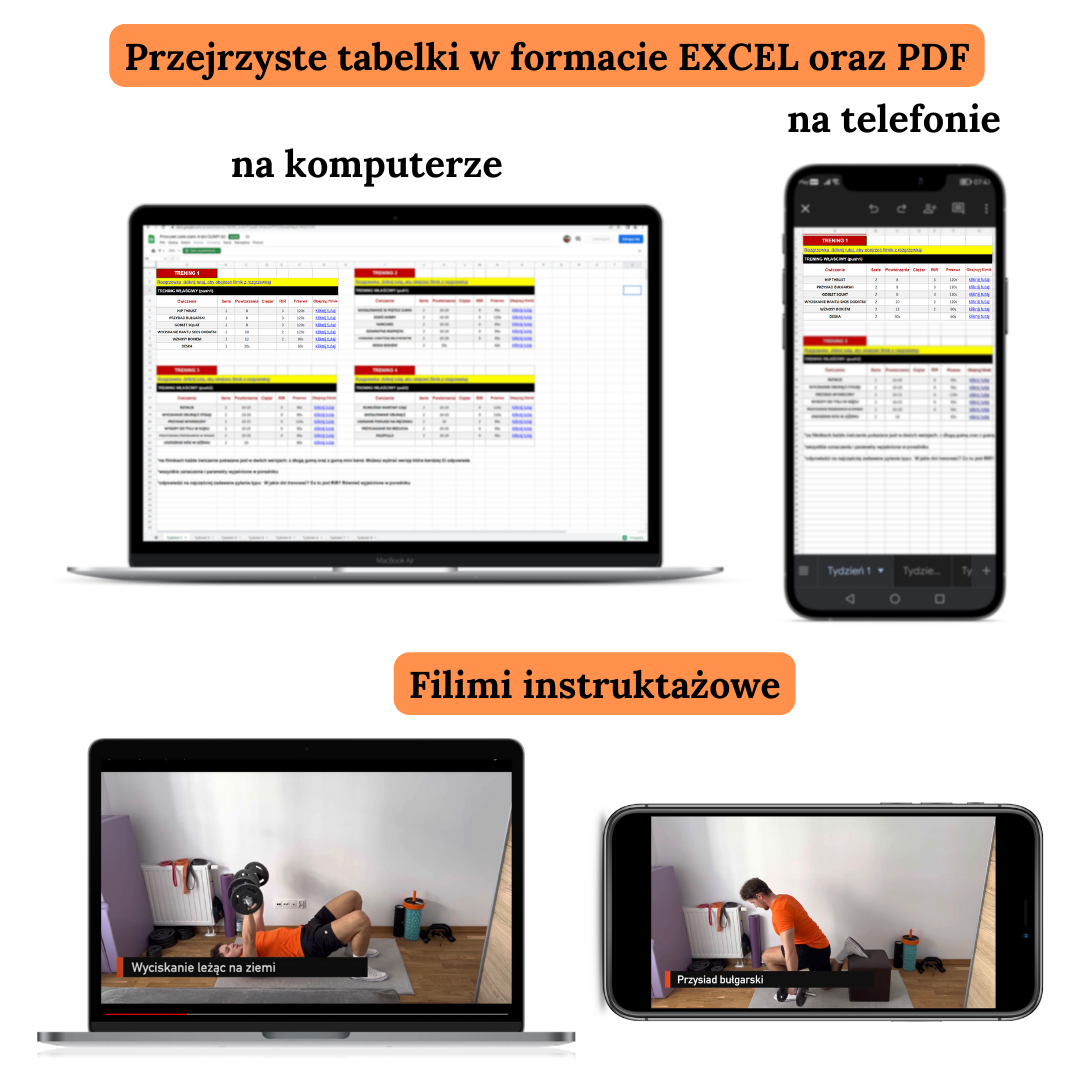 - W środku znajdziesz dokładną instrukcję jak korzystać z planu oraz 30 stron poradnika, aby wprowadzić Cię w świat treningu.